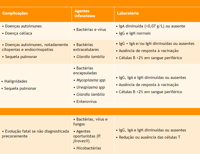 Nos pacientes com ICV, os sintomas podem começar em qualquer idade, especialmente na segunda e terceira décadas de vida. Há destaque para as infecções gastrointestinais, nas quais a Giardia lamblia configura um agente etiológico relevante, e para as sinopulmonares, causadas por bactérias extracelulares. Nesses casos, com frequência o quadro evolui para sequelas pulmonares, mesmo diante de tratamento adequado. Apesar de a característica principal da doença ser a deficiência de anticorpos, existe a possibilidade de alguns pacientes apresentarem também comprometimento da imunidade celular.