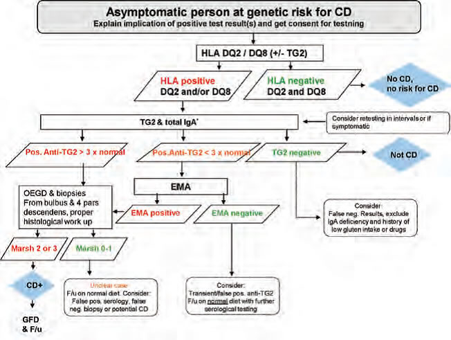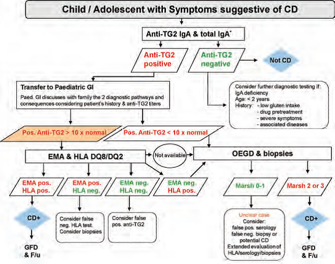 A confirmação diagnóstica da DC baseia-se em testes sorológicos para a investigação dos biomarcadores antiendomísio, antigliadina deaminada e antitransglutaminase, na genotipagem do HLA para a pesquisa dos heterodímeros DQ2 e DQ8 e em mudanças nas características histopatológicas do duodeno, tais como atrofia das vilosidades, hiperplasia das criptas e infiltrado inflamatório, vistas ao estudo histopatológico de fragmentos extraídos da região por biópsia endoscópica. Nas páginas que se seguem, você confere como e quando usar essas ferramentas de investigação.